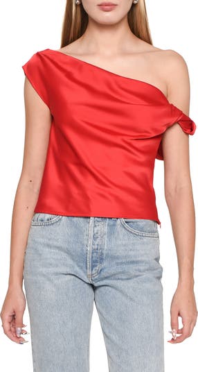 A twisted detail adds flirty fun to this blouse cut from supple satin and designed to showcase one shoulder.