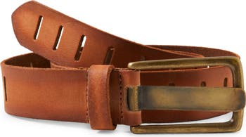 An antiqued effect lends distinction to the buckle and leather surface of this adjustable belt.