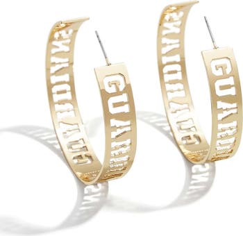 Add some Cleveland Guardians glamour to your outfits with these Large Cutout hoop earrings. BaubleBar and WEAR by Erin Andrews collaborated to create this glossy, gold-plated brass design featuring the team name in a repeating pattern. The post back helps give these Cleveland Guardians earrings a snug fit.