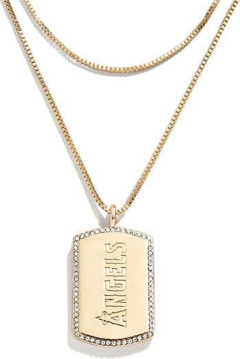 Make your team spirit sparkle and shine with this Los Angeles Angels Dog Tag necklace. BaubleBar and WEAR by Erin Andrews collaborated to create this layered set featuring debossed details on both sides of the dog tag pendant and shimmering embellishments. A lobster claw clasp ensures this Los Angeles Angels necklace fits just right.
