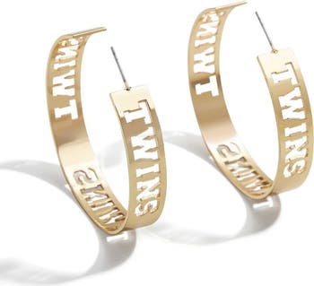 Add some Minnesota Twins glamour to your outfits with these Large Cutout hoop earrings. BaubleBar and WEAR by Erin Andrews collaborated to create this glossy, gold-plated brass design featuring the team name in a repeating pattern. The post back helps give these Minnesota Twins earrings a snug fit.