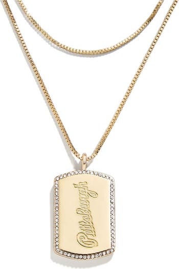 Make your team spirit sparkle and shine with this Pittsburgh Pirates Dog Tag necklace. BaubleBar and WEAR by Erin Andrews collaborated to create this layered set featuring debossed details on both sides of the dog tag pendant and shimmering embellishments. A lobster claw clasp ensures this Pittsburgh Pirates necklace fits just right.