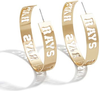 Add some Tampa Bay Rays glamour to your outfits with these Large Cutout hoop earrings. BaubleBar and WEAR by Erin Andrews collaborated to create this glossy, gold-plated brass design featuring the team name in a repeating pattern. The post back helps give these Tampa Bay Rays earrings a snug fit.
