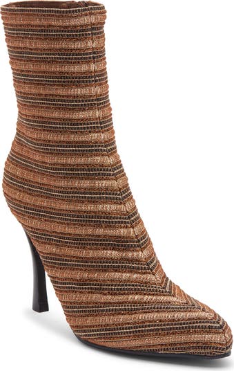 Woven stripes and shimmery metallic threads make a distinguished statement on this almond-toe boot set on a structured heel.