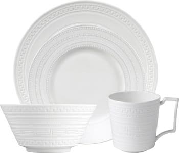- Set includes dinner plate, salad plate, cereal bowl and mug