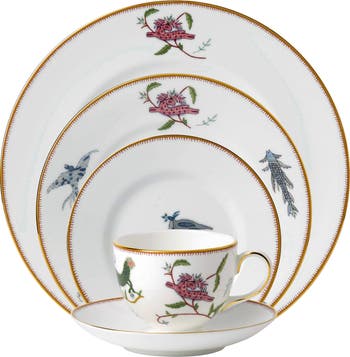 - Includes dinner plate, dessert plate, bread-and-butter plate, teacup and saucer