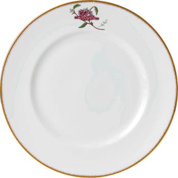 Mythical creatures artfully imagined by Kit Kemp make their way around this fine bone china dinner plate edged with a feathery goldtone rim.