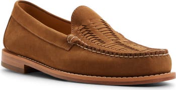 Hand-sewn topstitching around the huarache-inspired woven vamp lends a more relaxed aesthetic to a traditionally polished Venetian loafer crafted from soft leather.