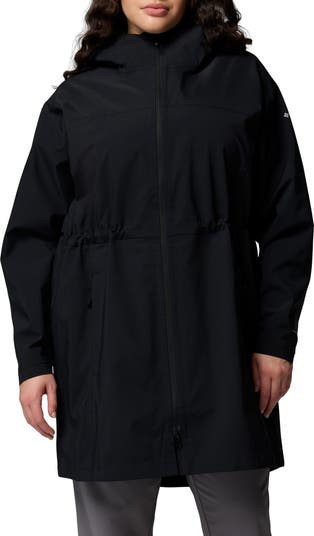 Drizzly hikes and blustery conditions are no match for the shower-shielding hood and Omni-Tech™ waterproofing of this ventilated jacket cut in a longline silhouette cinched with a drawstring waist.