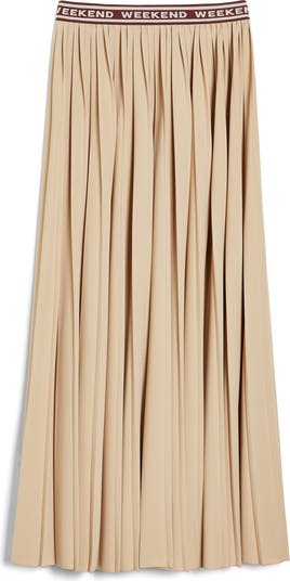 Allover pleats bring graceful movement to this flowy maxi skirt topped with elastic logo tape for comfort.