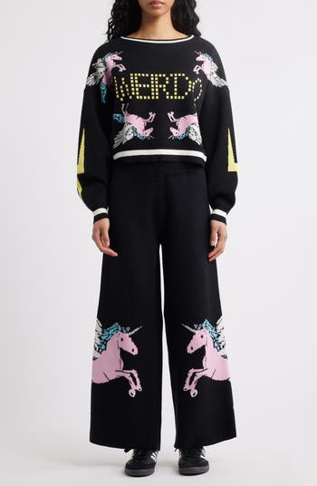 Here's to the weirdos. This comfort-focused set featuring double-knit jacquard graphics of pegasuses pairs a relaxed-fit sweater with matching wide-leg pants.