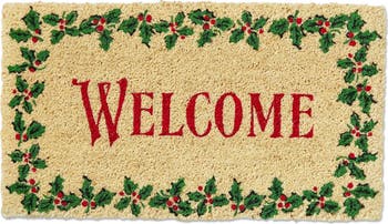 Welcome Holly Leaf Coir Door Mat - Natural Christmas Decor