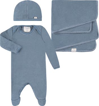 Welcome your little one home with this breathable, supersoft fleece set including a long-sleeve footie, cap and blanket in a serene blue hue.