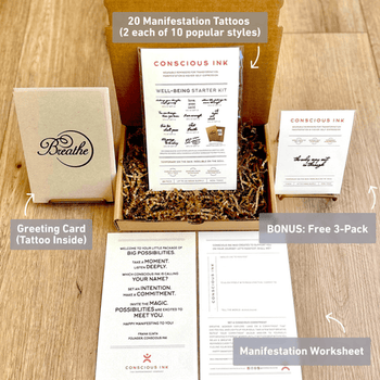 - Kit Includes: 20 Conscious Ink (2ea of 10 popular styles), 1 Tattoo Greeting Card, 1 Manifestation Worksheet, 1 Bonus Item.