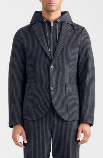 Brave unpredictable days in this pinstripe jacket that features a removable hooded bib so you're always ahead of the trends and the weather.