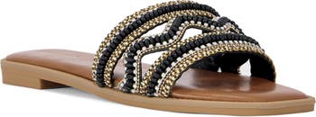 Polished beads and sparkling crystals add mixed-media charm to this breezy slide sandal.