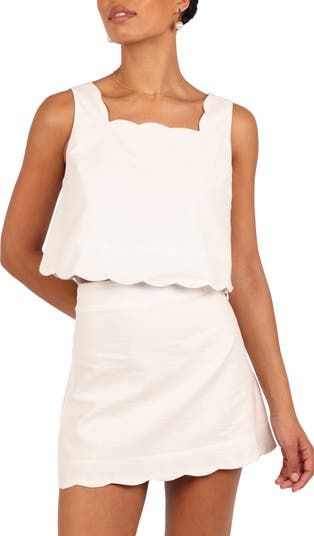 Sweet scalloped edges perfect the look of this boxy tank top that is made from a breezy blend of cotton and linen.
