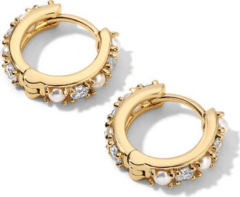 Sparkling stones and freshwater pearls make a luminous statement on these polished huggie earrings plated in sterling silver or 18-karat gold.