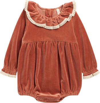 Give baby a luxe look without sacrificing comfort with this supersoft velour bodysuit tipped with a frilly collar.