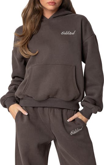 Logo lettering adds on-trend branding to the front of a comfy-casual cotton-blend hoodie made with dropped shoulders and a relaxed fit.