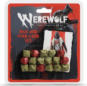 Enhance your game of Werewolf: The Apocalypse with these custom dice and cards designed for clarity and style. Each set of official Werewolf: The Apocalypse 5th Edition dice contains a set of dice for one player and five form cards to track which of the five forms their character is in and remember the rules for that form. Each set of official Werewolf: The Apocalypse dice contains: 12 Custom Ten-sided Green Normal Dice, 5 Custom Ten-sided Red Rage Dice, 5 double-sided form cards. Werewolf the Apocalypse is a Storytelling Game of Environmental and Spiritual Horror. Gaia is dying. The ices melt, while the seas swell. The heat rises, while the forests wither. Extinction threatens millions, in favor of the few. The Garou—warlike shapeshifters torn between Rage and spirit, between Wolf and Man, and champions of the earth-mother—have failed. The Apocalypse is here. Yet, a new generation of Garou now call upon their Rage to confront the forces of destruction, avarice, and greed ravaging the earth-mother. With tooth and claw the Garou will wrest her from the brink of death—or follow her enemies to the grave. Will you answer their howl? What legends will the Garou sing of you? When will you Rage?