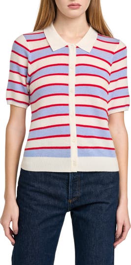 Allover stripes enliven this woolly collared cardigan updated with abbreviated sleeves.