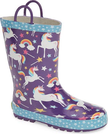Magical unicorns on a waterproof rubber rain boot make it fun to plant little feet in any puddle and keep them dry. Top handles make it easy to pull on, while a grippy tire-tread sole provides added traction on wet sidewalks or muddy fields.