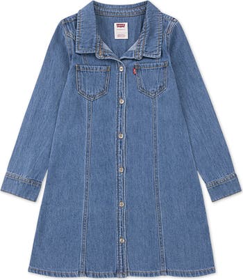 Classic detailing like a tailored fit and crisp cotton construction define a denim shirtdress that has baby looking oh-so stylish.