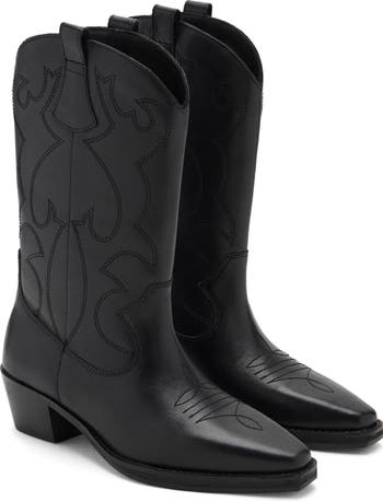 Bring a boost of Western charm to your look with this leather pull-on boot fronted by a snip toe and balanced on a block heel.