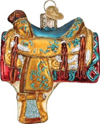 Bring a hefty dose of Western swagger to your holiday tree with this glitter-dusted glass ornament in the shape of a horse's saddle.