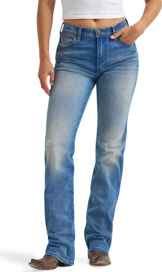 Slip into the iconic western style of these nonstretch-denim jeans fitted through the thighs into relaxed straight legs and finished with signature Wrangler details. Light distressing and fading give these jeans the ultimate lived-in look.