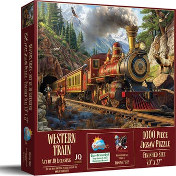 Embark on an enchanting journey with the Western Train 1000 Piece Jigsaw Puzzle, crafted by artist Steve Henderson, where rugged landscapes merge with the nostalgic allure of a classic steam engine, inviting you to experience the thrill of the Wild West amidst majestic mountains and untamed nature. SunsOut Puzzles consist of interlocking pieces made from high-quality puzzle board, adorned with vibrant colors using eco-friendly soy-based inks that ensure hours of delightful puzzling. As a proud woman-owned small business, SunsOut is deeply committed to sustainability, allowing you to indulge in your hobby with a clear conscience. Each puzzle is made in the USA under the highest manufacturing standards; should you encounter any missing or damaged pieces, our dedicated customer service team ensures a prompt resolution for your peace of mind. With completed dimensions of 20" x 27", the Western Train puzzle makes a timeless gift for adults and puzzle enthusiasts alike, whether for a holiday, birthday, or simply as a thoughtful gesture, offering endless enjoyment and tranquility as you embrace this captivating challenge.