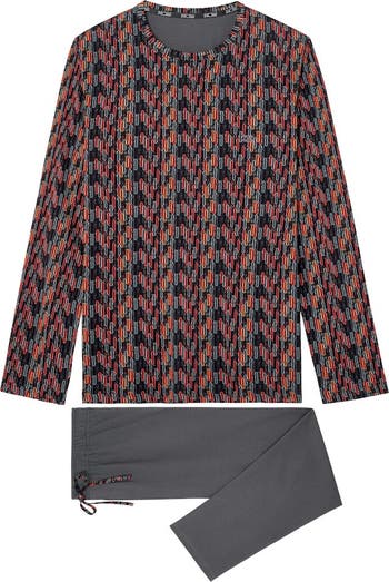 The Westgate Long Pajama Set offers a perfect balance of comfort and modernity. Made from 100% cotton, it guarantees breathability, a natural feel and freedom of movement throughout the night. The flowing dark grey pants are paired with a long-sleeved T-shirt featuring a contrasting geometric print inspired by the artistic frescoes of the 1950s. The HOM logo adds an elegant finishing touch.
