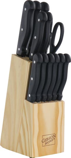 The Gibson Home Westover 13 Piece Stainless Steel Cutlery Set in Black with Wood Storage Block. This set's stainless steel make provides long lasting sharpness with well balanced riveted handles. Made for supreme efficiency, the smooth and durable handles are ergonomically designed for the hand grip. Slice tomatoes, carve meats, chop veggies, or perform any other necessary tasks for the perfect dish!