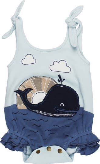 A friendly whale appliqué adds a whimsical feel to a tie-strap bodysuit featuring a smooth lining and snaps between the legs for easy changing.