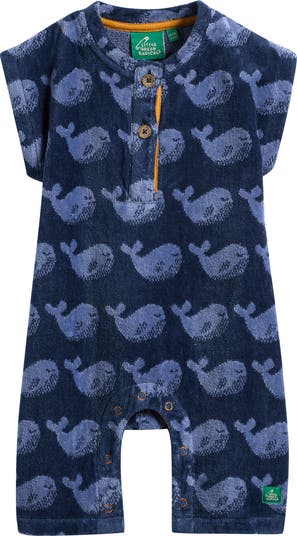 Big blue whales pattern a short-sleeve romper cut from a soft terry knit, with snaps between the legs for quick and easy changing.