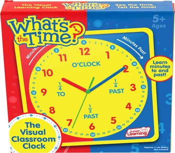 WHAT'S THE TIME: CLASSROOM CLOCK - Junior Learning What’s the Time? Visual Classroom Clock. A fully operational battery powered wall clock, offering a visual way to teach children the concepts of hours and minutes. Color coded to represent minutes past and minutes to for easy and fast recognition. This classroom clock is perfect to emphasize learnings from Junior Learning’s geared classroom clock. Kids and students can learn a new skill in a fun way! The bright visuals and playful design takes learning to a level of engagement and excitement that standard clocks can't beat. Battery Powered children's learning clock. Requires (1) AA battery to use (battery not included).