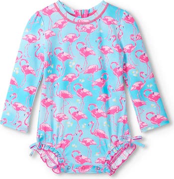 Make your little one's seaside days memorable in this fab flamingo-themed one-piece swimsuit framed by protective long sleeves.