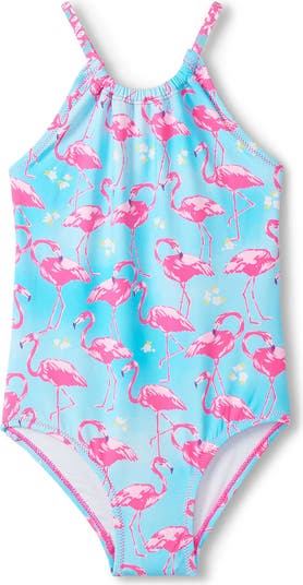 Make your little one's seaside days memorable in this fab flamingo-themed one-piece swimsuit trimmed with contrast drawstring-neck straps that form a sporty racerback.