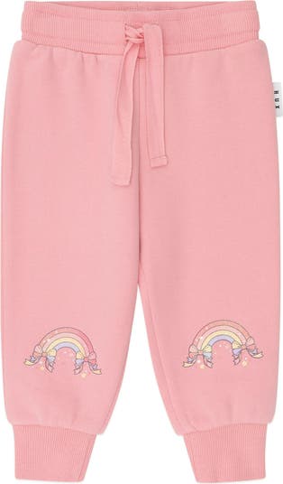 Made from fluffy organic cotton terry, these track pants feature a functional drawstring for an adjustable fit, rainbow embroidery on the knees and a soft, stretchy waistband to keep little tummies snug. Made for all day play. Bar tacked at back.