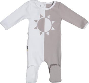 A whimsical shape is divided by the two tones of this cotton-rich footie made for baby's comfort.