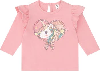 The perfect frill sleeve top, but with a sparkly twist. Made from buttery-soft organic cotton in a soft pink hue with a keyhole closure at the neck and features a sparkly unicorn embroidered on the tummy.