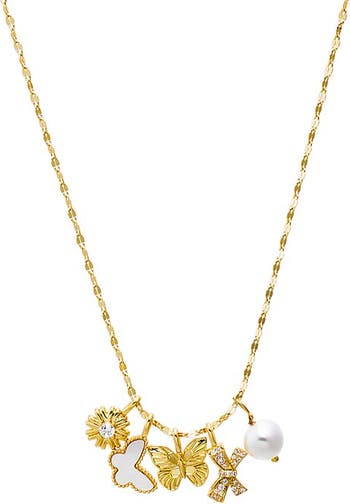 The Whimsy Garden Multi-Charm Necklace by Adina Eden is a refined Combo Set that balances simplicity and shine. Timeless yet trendy, this necklace for women is styled in Pearl White for everyday ease. No matter the plan or pace, you'll be surprised how naturally it works into your routine while still standing out just enough. Mix this gold plated necklace with selections from the Layered Sets collection to complete your look with ease and style. It's refined, reliable, and made to be styled again and again.