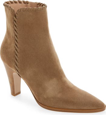 Expertly crafted in Italy with a sharp pointy toe, this suede bootie is wrapped with leather whipstitching at the edges and elevated on a lofty heel.