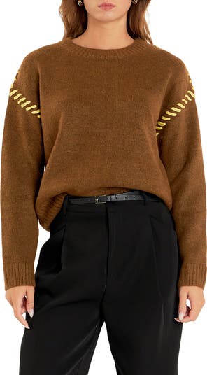 Contrast whipstitching adds a charming detail to a classic pullover sweater knit from lightweight yarns.