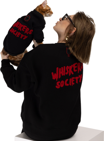 Introducing the peak of adorable twinning: Whiskers Society Pet Human Sweatshirts!Unveil a new level of adorableness with our design. Highlighted by the dapper red "Whiskers Society" embroidery on the back, adding a delightful feline flair to your pet's wardrobe. | Your furry friend deserves the best, and we've crafted the purrfect sweatshirt for them, ensuring 80% Cotton for a touch of luxury and 20% Polyester forease of usage anddurability. This black sweatshirt is not only a fashion statement but also a sign of where they belong; the holly Whiskers Society! | From casual outings to relaxed weekends, this sweatshirt is purrrfect for any occasion. You can create memorable twinning moments with your precious because Whiskers also has hooman version! Show off your love for your pet and embrace the unity of the Whiskers Society in style.