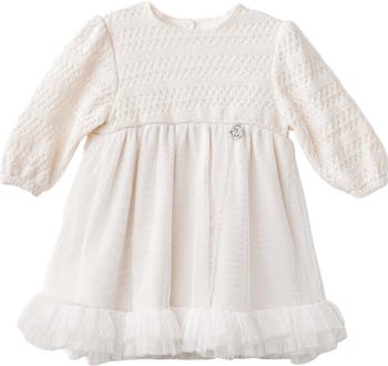 A delicate blend of texture and grace, perfect for christenings, celebrations, or holiday portraits. Knitted bodice and sleeves offer cozy elegance with heirloom charm. Gathered skirt with tulle ruffle hem adds soft volume and movement. Floral waist detail completes the look with a touch of vintage romance.