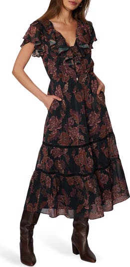 A boho-chic floral print blossoms on this ruffle-trimmed dress that's an effortlessly elevated addition to your wardrobe.