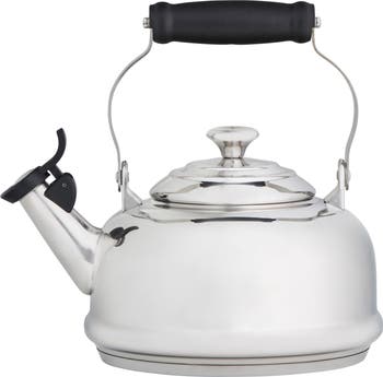 Durable stainless-steel composition with a polished, high-shine finish ensures this classic tea kettle will stand the test of time.