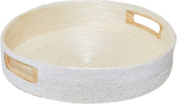 This beautiful hand-beaded tray uses locally sourced beads to create an intricate, coastal inspired look. 16" W x 3.5" H White Made with locally sourced beads stitched on a raffia base Our hand-beaded products are crafted with delicate detail by our artisan partners in Rwanda who stitch glass and locally sourced beads using a needle and thread Handles are placed on each side for added functionality and style The White Beaded Handle Tray a perfect housewarming gift that can be used as a lovely accent to a coffee table, kitchen island, or to treat yourself to breakfast in bed!
